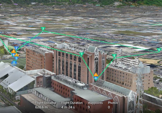 既存建築物・高圧線などの障害物を避けながら安全なルートを設計できるかを検証。
