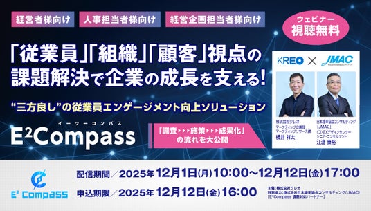 従業員エンゲージメントは「測って終わり」では価値になりません。データを起点に、現場との対話から施策実行、成果確認まで回し切る仕組みが不可欠です。クレオはマーケティングカンパニーの視点で、従業員・組織・顧客の三方向から課題を捉え、従業員エンゲージメントをCSと企業成長へつなげるパッケージ『E²Compass』を開発。本ウェビナーでは、その設計思想と導入から定着、成果化のロードマップを事例とともに紹介します。