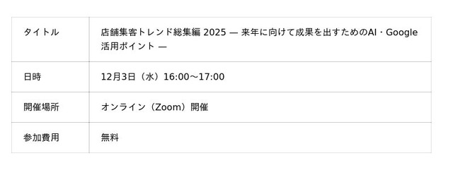 株式会社ロカオプ(本社:東京都新宿区新宿 代表取締役:縣将貴、以下:ロカオプ)は、株式会社インティメート・マージャー(本社:東京都港区六本木 代表取締役:簗島亮次、以下:インティメート・マージャー)と共催で、12月3日(水)16:00より無料のオンラインセミナー『店舗集客トレンド総集編 2025 - 来年に向けて成果を出すためのAI・Google活用ポイント -』を開催いたします。