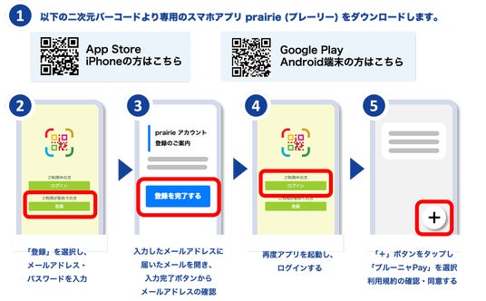 「ブルーニャPay」は、株式会社ミラボが提供する専用スマホアプリ「prairie」をダウンロードし、ポイントをチャージすることで、スマートフォンだけでスムーズにお買い物をお楽しみいただける「ポイントシステム」です。