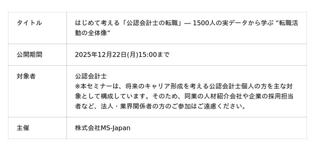 管理部門・士業に特化した転職エージェントを運営する、株式会社 MS-Japan(本社:東京都千代田区 代表取締役会長 CEO:有本隆浩/以下 MS-Japan 証券コード:6539)は、2025年11月20日(木)に開催した無料オンラインセミナー『はじめて考える「公認会計士の転職」― 1500人の実データから学ぶ “転職活動の全体像“』のアーカイブ配信を開始しました。
