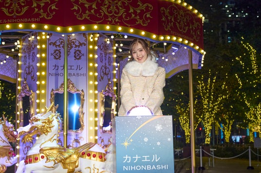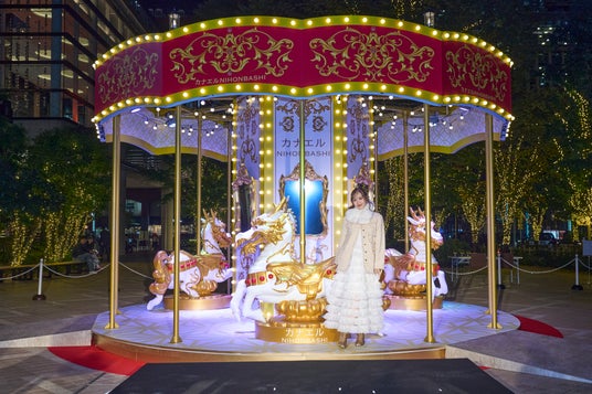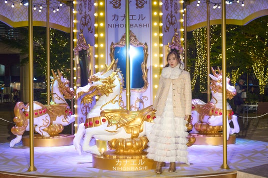 11月20日(木)に実施された点灯式には、タレントの藤田ニコルさんをゲストにお招きしました。メインシンボルの“麒麟ゴーラウンド”が点灯すると、会場からは大きな歓声が上がり、日本橋の街が幸運の煌めきに包まれました。