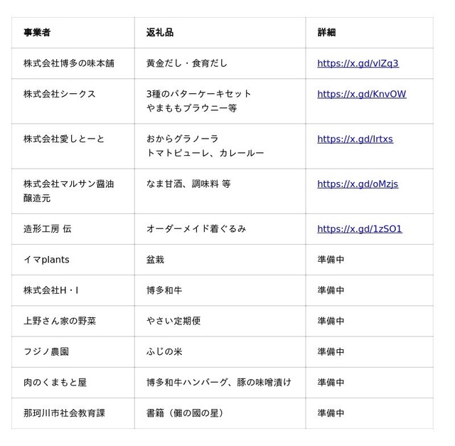 新規参画事業者/新規返礼品のご紹介(那珂川市内事業者/敬称略・順不同)