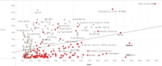 エンタメブランドのファンダムマップ[横軸:日本×縦軸:ブラジル][バブルの色:赤色(日本エンタメブランド)、灰色(その他の国のエンタメブランド)]