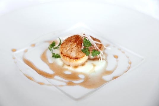 エクストラバージンオリーブオイルでソテーした新鮮なホタテ貝の甘味と蕪のほどよい苦み、赤ワインビネガーの柔らかな酸味に煮詰めたハチミツの甘味を加えたソースを掛け合わせ、素材と調味料による立体的な味のコントラストを表現したひと皿。