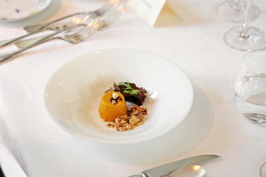 カボチャの甘さをバルサミコ酢のおだやかな酸味が包み、口の中に甘さが残らず後味がすっきりする。これにより、口の中と胃がこの後のメイン料理を受け入れる準備が整う。イタリア料理の健康を意識した創意工夫、理にかなった組み立てが理解できる。