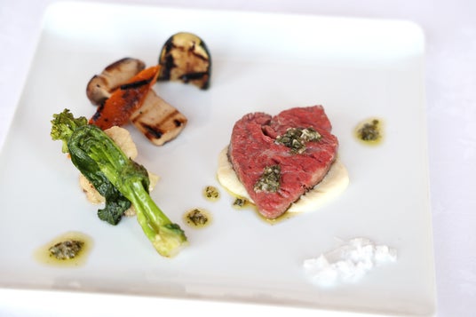 低温調理でやわらかく仕上げた和牛ヒレ肉に、海塩と4種のハーブとエシャロットをエクストラバージンオリーブオイルでマリネしたオイルソースを添えた。食べ手が皿の上でオイルソースを調味料として使い、和牛ヒレ肉の旨味を引き出していく楽しみを発見できる。