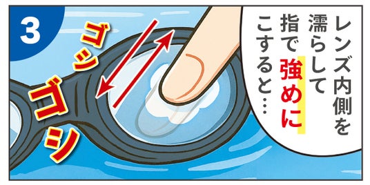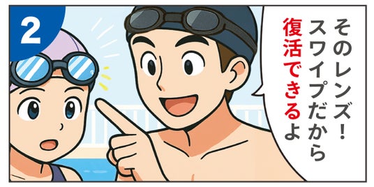 こすって復活するVIEW独自のくもり止め技術「SWIPE ANTI FOG(スワイプ アンチ フォグ)」は、スイミングゴーグルがくもった際に、レンズの内側を濡らして"指で強くこする"ことでくもり止め効果が復活します。スワイプ搭載モデルは当社従来品に比べ、くもり止め効果持続性平均10倍を実現しました。
