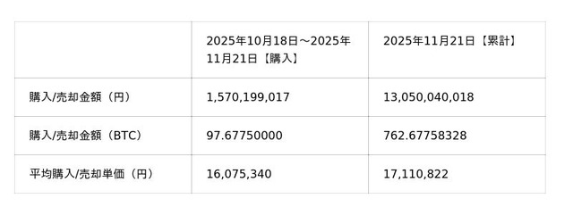 当社は、ビットコインの保有戦略についても、市場依存リスクを抑えつつ財務貢献を最大化する方針に基づき、2025年10月18日~11月21日の期間に 97.67750000 BTC を追加取得いたしました。