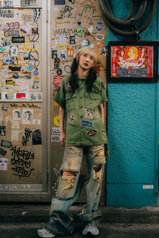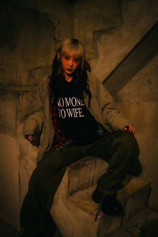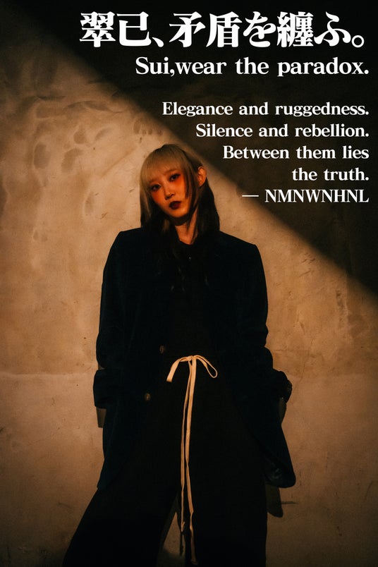 今回白羽の矢が立った翠已は元々古着が大好きで、SNSで公開されている古着も非常にセンスが溢れている。今回の撮影でも、翠已の私物古着を使用したコーデが含まれており、NMNWNHNLのアイテムとの親和性も高い。翠已自身は今回の撮影について「今まで自分が経験してこなかった事にも積極的に挑戦していきたいと思っていたタイミングで、NMNWNHNLにアパレルしかも古着を使ったキービジュアルの撮影のお誘いをいただいたので、快く引き受けました」とのこと。そうして完成したキービジュアルはNMNWNHNLと翠已、新しい挑戦を始める二者の化学反応が双方の魅力を高め合う結果になったと言える。