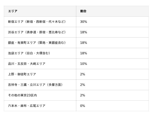 一方で六本木・麻布エリアは0%と、比較的高価格帯の地域は利用者が少ない傾向にあります。
