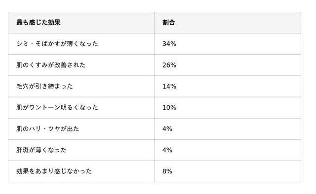 - 感じた効果として「シミ・そばかすが薄くなった」が最多で34%を占めた