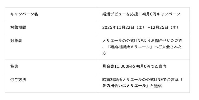 そこで「メリエール」では、婚活の一歩を後押しすべく【初月0円キャンペーン】を実施いたします。
