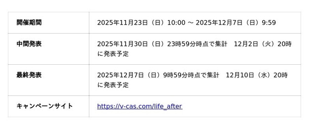 株式会社アイブレイド(本社:東京都豊島区 代表取締役:妻木 泰夫)が運営するVTuberキャスティングサービス「ぶいきゃす」(https://v-cas.com/)は、NetEase Gamesが提供する終末オープンワールドサバイバルゲーム『ライフアフター』において、総勢28名のVTuberが参加する配信イベント「ライフアフターサバイバル頂上決戦~生き延びる力を競え~」を2025年11月23日(日)10:00 ~ 12月7日(日)9:59の期間で、開催することをお知らせいたします。