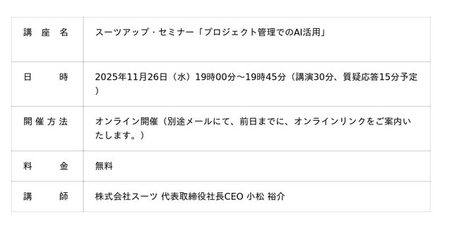 当社では、2025年11月26日(水)19時から、当社代表の小松が講師を務めるスーツアップ・セミナー「プロジェクト管理でのAI活用」を無料開催します。