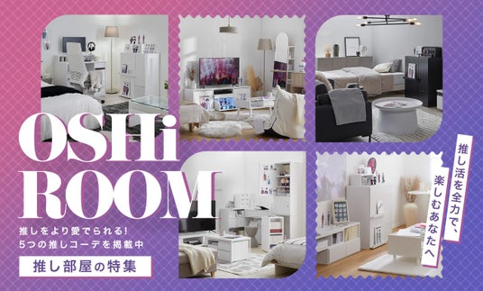 推し活グッズを可愛くすっきり収納できる「推し活収納オシテル」「サイドチェスト付きドレッサーデスク」「収納付きカウチソファベッド」など、ロープライスかつ機能的な家具が次々と部屋をアップデート。