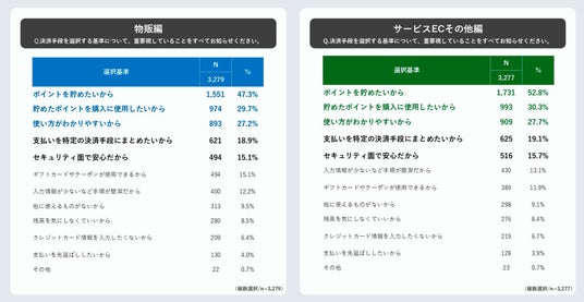 物販・サービスEC等共に「ポイントを貯めたい」が約半数と最も多く、「使いやすさ」「安心感」も上位に挙がった。