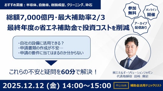 株式会社エネルギーソリューションジャパン(本社:東京都中央区、代表取締役:田崎 剛史、以下ESJ)は、2025年12月12日(金)に中小製造業向けセミナー「設備投資するなら今がチャンス!経産省 省エネ補助金で投資コストを大幅削減する実践セミナー」をオンラインで開催いたします。総額7000億円・最終年度となる大型省エネ補助金について、採択率実績100%(工場事業所型)・80%(設備単位型)のコンサルタントが、自社設備への活用方法から採択のポイントまでを60分で徹底解説いたします。