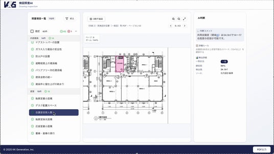 事前に設定された照査項目に基づき、AIが自動的に適合・不適合を判定。照査結果は一覧表示され、各照査結果に関しては、AIがどの箇所を読み取って判断したのかを図面上にハイライト表示。PDFへの出力も可能です。