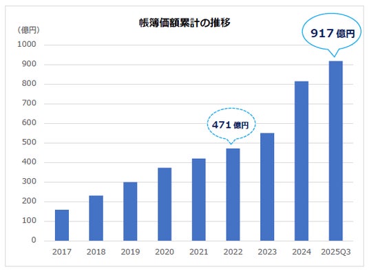 当事業で保有する不動産の帳簿価額累計は安定的に増加し、2025年第3四半期末時点で917億86百万円となりました。購入累計額1,000億円の段階(2022年時点)では471億円であったことから、帳簿価額は3年で約2倍に成長しました。