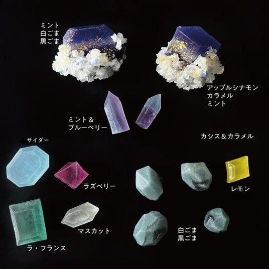 原材料名:砂糖(国内製造)、寒天、白ごま、りんご果汁、黒ごま、洋梨リキュール、ラズベリーリキュール、ミント、マスカットリキュール、ブルーベリーリキュール、レモンリキュール、シナモン/トレハロース、着色料(アントシアニン、スピルリナ青、クチナシ黄、金箔)、酸味料、香料、(一部にごま・りんごを含む)