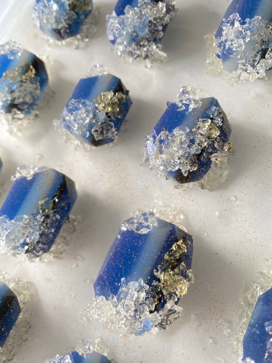 切りたてのラピスラズリのこうぶつヲカシ。刻んだ寒天と金粉で本物の原石のような風合いを出している。