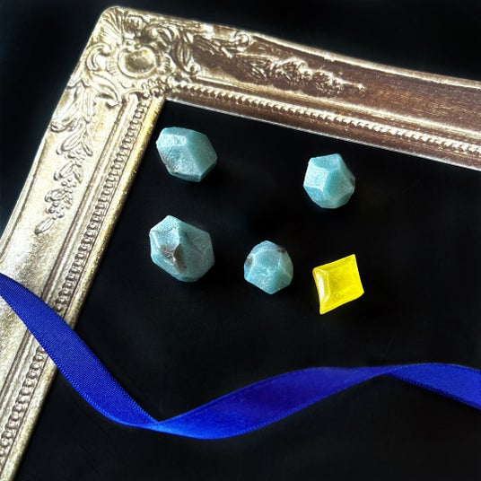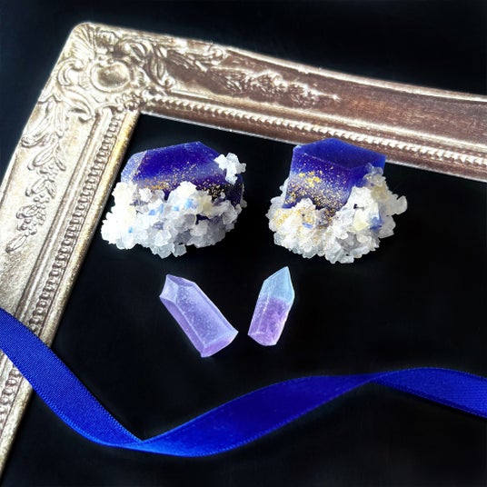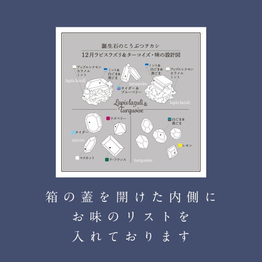 毎月一か月間だけお作りする誕生石のこうぶつヲカシ。日本の伝統的和菓子、琥珀糖を手切りの技術で宝石や鉱物のように形作っていきます。12月の誕生石である、ラピスラズリ・ターコイズ・ジルコンのさまざまなブルーやグリーンの鉱物たちを表現しました。 幾層にも重なる青、白、黒のグラデーションが特徴的なラピスラズリや、特徴的な模様のターコイズ(トルコ石ともよばれる)など、本物の鉱物のような造形にこだわったこうぶつヲカシをデザインし詰め合わせました。どれも綺麗なブルーの輝きが魅力的な石たちを濃紺の化粧箱でお届けします。