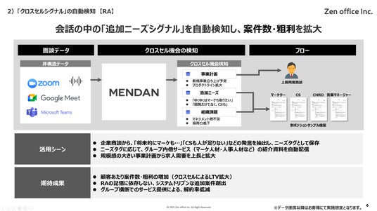 Zen office株式会社(本社:大阪市中央区、代表取締役:岩瀬 恭裕)は、人材紹介特化の音声×AIエージェント「MENDAN」に、新機能「音声データ施策活用」機能を追加いたしました。面談・商談の音声データから「競合エージェント名」「応募企業」「クロスセル機会」などを自動抽出し、CRM・BIツールと連携。データドリブンな競合対策と、顧客あたり売上・粗利の最大化を実現します。