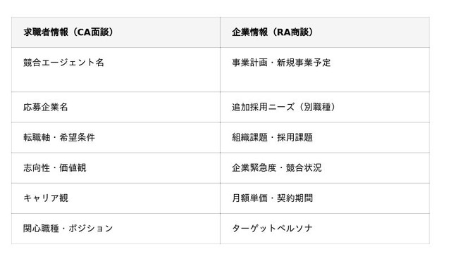 人材紹介における面談・商談の会話には、求職者の本音や企業の潜在ニーズなど、CRMの入力項目だけでは捉えきれない情報が詰まっています。MENDANはこの「非構造データ」を「構造化データ」に変換し、マーケティング・営業・経営のあらゆる施策に活用できる状態を実現します。【変換される主なデータ項目】