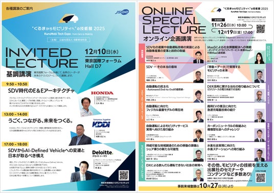 本年は特に、ソフトウェア定義型車両(SDV)、自動運転・ADAS、AI・UX、スマートシティ、通信インフラ、エネルギー・LCA、サーキュラーエコノミーといった重点テーマを設定し、第一線の専門家による講演を予定しています。