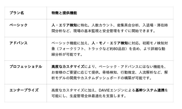 - DAVIE Motion Analysis (DAVIE MA):映像解析に特化し、特定の現場課題を「早く」「安く」「簡単に」解決することに焦点を当てた、今回の新製品となるパッケージアプリケーションです。