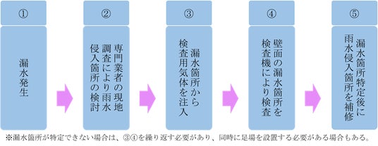 従来の漏水箇所特定方法は、空気よりも軽い検出用気体を漏水箇所(室内側)から注入し、外壁部(屋外側)から検出器を使用することで、壁部の漏水箇所を特定する方法が一般的でした。この方法では、検出器の検査範囲が狭いことから、外壁部に足場を組み至近距離で検査をする必要があるため、足場を設置するための費用をはじめ、漏水箇所を特定するまでに時間がかかる点を課題としておりました。