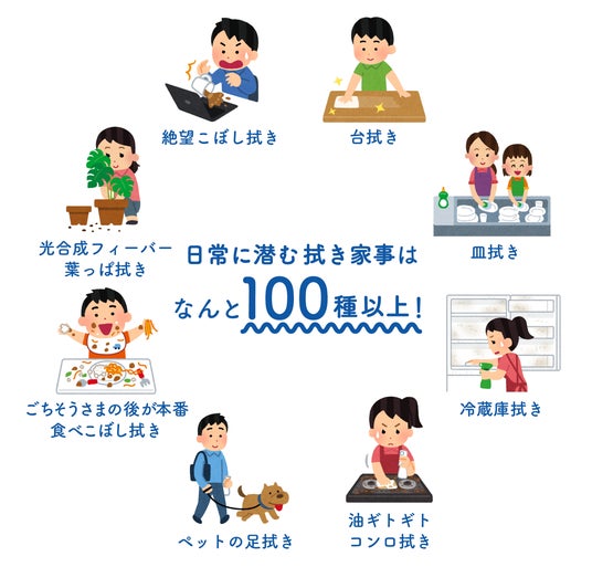 台拭きや皿拭きなど日常的な拭き掃除から、不意のこぼし拭き、子どもの食べこぼし拭きまで、日常に潜むさまざまな拭く行為を「拭き家事」と命名。