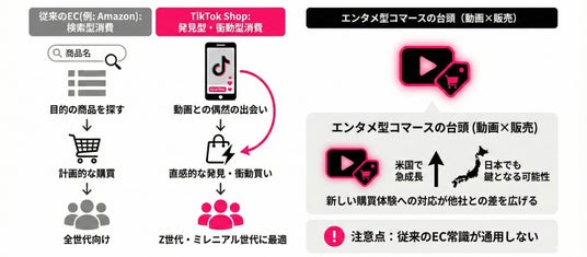 TikTok Shopは、これまでのAmazonなどと異なり、「検索ではなく発見から始まる購買体験」に強みを持つECプラットフォームです。