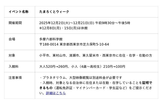 このたび5市の魅力を紹介する「たまろくとウィーク」を開催し、この期間中は5市の市民のみなさま(注1)を入館料半額でお迎えします。