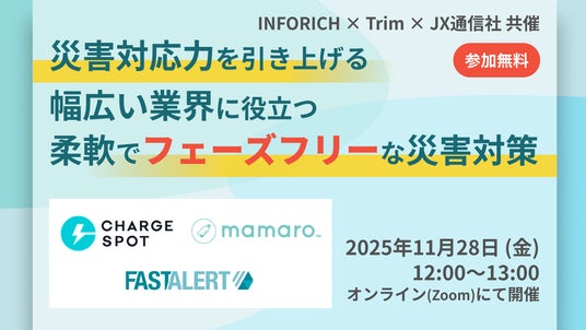 防災DXを推進する報道ベンチャーの株式会社JX通信社(東京都千代田区、代表取締役 米重 克洋、以下「JX通信社」)・株式会社INFORICH(東京都渋谷、代表取締役 Group CEO:秋山 広宣、以下「INFORICH」)・Trim株式会社(神奈川県横浜市、代表取締役社長 長谷川 裕介、以下「Trim」)は、11月28日(金)共催ウェビナーを開催することをお知らせします。