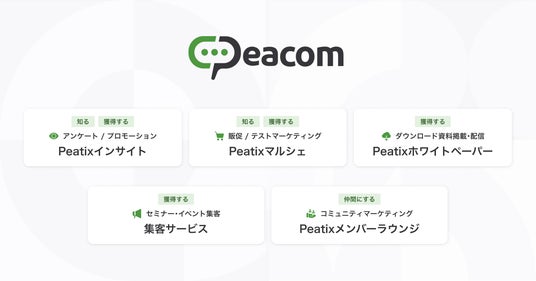 近年、顧客との長期的な関係構築が企業にとって不可欠となる中で、コミュニティの力が改めて注目されています。しかし、多くの企業がイベント開催やコミュニティ形成に取り組む一方で、その熱量をマーケティング活動に効果的に活用できていないのが現状です。「Peacom」は、こうした課題を解決するために、年間560万人が利用するピーティックスのデータベースを活用した複合型ソリューションです。企業の顧客を「知る・獲得する・仲間にする」活動を一貫して支援してまいります。