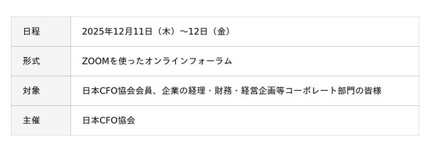 本フォーラムでは、企業改革の最前線で培われた実践知、AI・デジタル技術を活用した財務変革、そして先進的なFP&A手法まで、CFOが企業変革をリードするための具体的な知見と経験が共有されます。