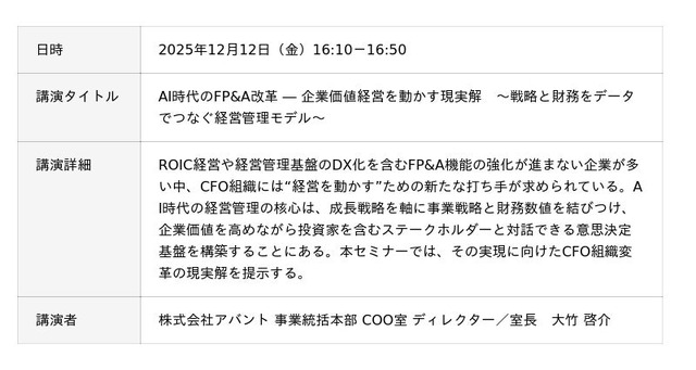 アバントは本フォーラムにて、「AI時代のFP&A改革 ― 企業価値経営を動かす現実解~戦略と財務をデータでつなぐ経営管理モデル~」をテーマに講演いたします。AI時代の経営管理に求められる、成長戦略を軸に事業戦略と財務数値を結びつけ企業価値を高める意思決定基盤構築の構築について、ROIC経営やFP&A機能強化に向けたCFO組織変革の現実解を提示します。