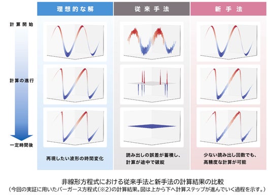 両社は共同研究を通じて、そうした長年の課題に実用的な解決策を見出すことに成功しました。量子計算の関数に含まれる波形や周期的な特徴(フーリエ係数など)を効率的に抽出し、少数の主要成分から解を再構成することで、データ量が増えても処理効率を維持し、大規模シミュレーションにも対応できる読み出しを可能にしました。この新手法により、非線形方程式の計算において量子コンピュータが持つ理論的な高速性を実際の計算で発揮することが可能となり、読み出し問題を克服して指数関数的な加速を実証しました。