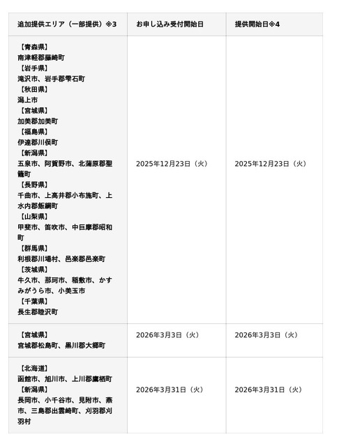 2025年12月23日(火)に予定しているエリア拡大については、2025年6月26日に報道発表済みですが、今回の拡大では、既に追加提供を発表していたエリアに加え、新たに提供可能となるエリアを追加し、より多くのお客様にサービスをご利用いただけるようになります。