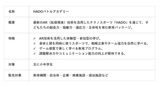 本パッケージはHADOという身体と頭の両方を同時に使う ARスポーツを実践することで、未来に必要な「創造力」「協働力」「適応力」「主体性」の実践的スキルを子どもたちが楽しく習得することを目的としております。