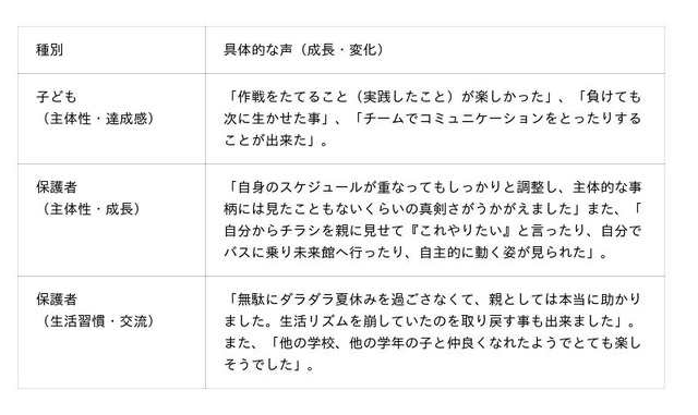参加した子どもたちの間で主体性、課題解決力、協調性が向上する教育的価値がアンケート等から認められ、保護者の約95%から高評価をいただきました。