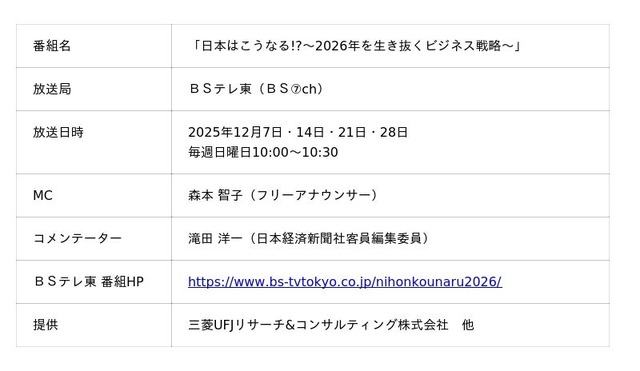 三菱UFJリサーチ&コンサルティング株式会社(本社: 東京都港区、代表取締役社長: 池田 雅一)は、BSテレ東の特別番組「日本はこうなる!?~2026年を生き抜くビジネス戦略~」への番組提供をいたします。12月7日を初回に、同月毎週日曜日 午前10時より、4週連続で放送します。本番組へは、当社のエコノミスト・研究員・コンサルタントも出演いたします。
