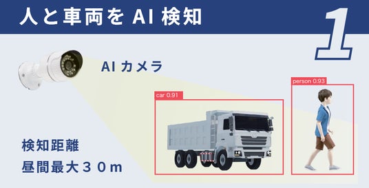 本サービスは、当社が提供するAIカメラとアラーター(ライト+スピーカー)を組み合わせたレンタルサービスです。従来の安全管理に替わり、歩行者・ドライバーの双方への注意喚起や、省力化が可能です。防犯用途としての使用も可能です。