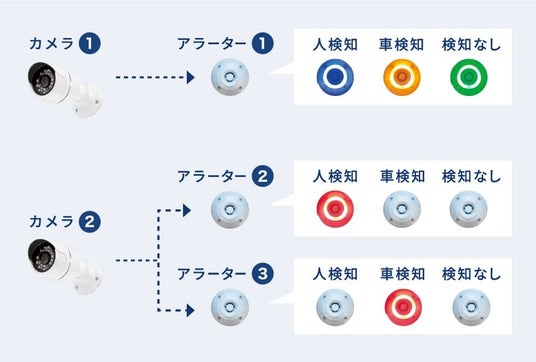 一つのカメラに対して複数のアラーターを設定できるため、複数箇所に設置したり、検知項目に合わせて使い分けたりすることができます。また、アラーターごとに発光色や光らせ方・音の種類などを選択可能です。