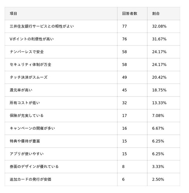 - 三井住友カードを選んだ理由TOP3は「年会費が安いから」「三井住友銀行を以前から利用していたから」「ポイント還元率がアップする店舗・サービスが多いから」。