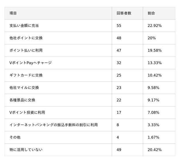 - 三井住友カードの利用で貯まったVポイントの最も定番な活用法は、全体の約23%が挙げた「支払い金額に充当(キャッシュバック)」。一方で、貯まったVポイントを「特に活用していない」層も20%ほど存在する。