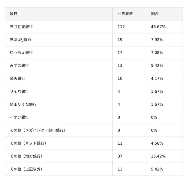 - 三井住友カードの引き落とし口座は「三井住友銀行」が最も多く、全体の約47%を占める。次いで「その他(地方銀行)」が約15%、「三菱UFJ銀行」が約8%と続く。