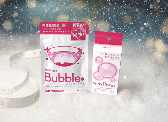 また、「mm flora*Bubble(エムエムフローラ バブル)」は、水がなくても手軽にオーラルケアができる商品なので、飲み会後や外出先など、“今すぐスッキリしたい”場面で活躍します。炭酸の発泡により唾液を出やすくするので、冬に起こりがちなドライマウス対策にもぴったりです。
